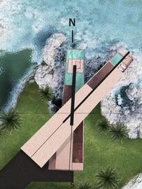 In Layout Plan, the house entry from the upper floor with the Kitchen is locate near by, welcoming home with the aromatic fragrant from home cook dishes. The openness of the living area allows the space to interact and integrate with its spacious surrounding. The continuity of the living area to the outdoor infinity pool stretches the space to a boundaryless grandeur. The outdoor living is set in a shallow pool which is casting the reflection of the sky on its constant moving surface. The shallow pool also help reduce surrounding temperature. Bedrooms are located at the lower story, closer to the surrounding contexts. Two bedrooms have their own scenic view with terrace for seatings and outdoor breeze.